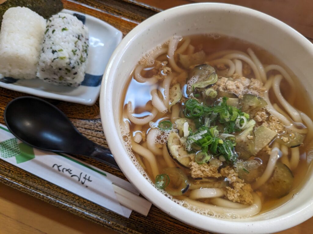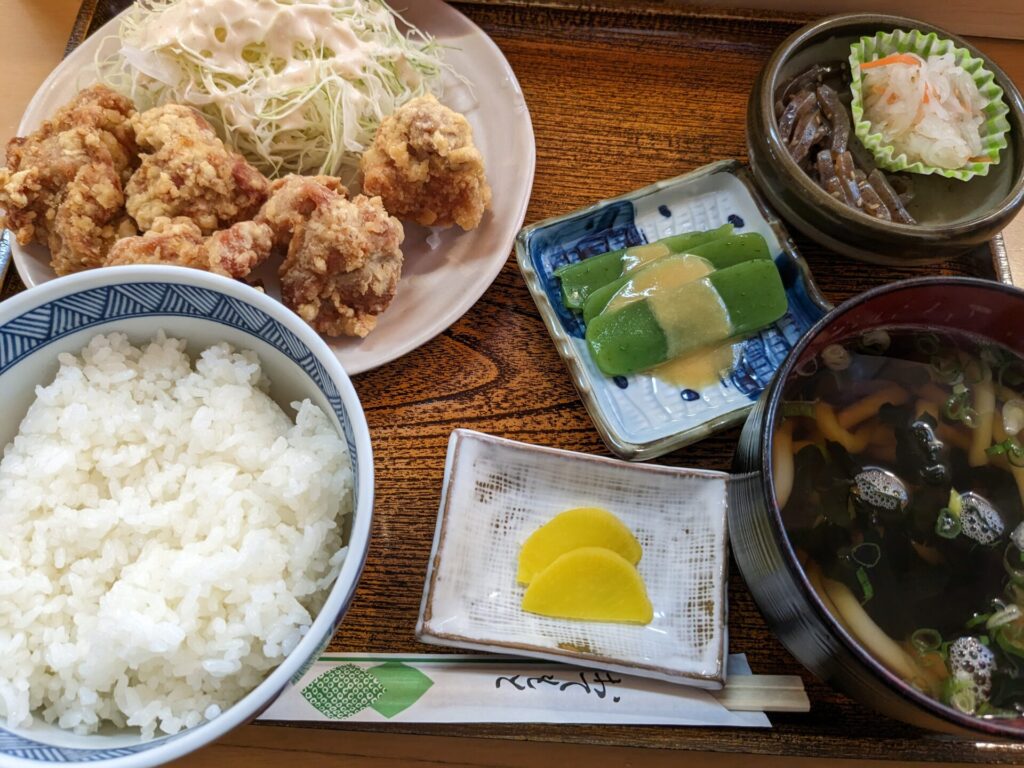 僕が食べたむささび定食は、刺身こんにゃくなどはついていましたが、普通のから揚げ定食のような感じでした。ツガニうどんのほうは、カニの濃厚なだしと、おむすびがすごくおいしかったようです(この道の駅では、おむすびが人気とのこと)。せっかくなのでここでしか食べられない、ツガニうどんにすればよかったかなあ、とあとから少し思いましたが、から揚げもすごくおいしかったので、結果満足です(笑)