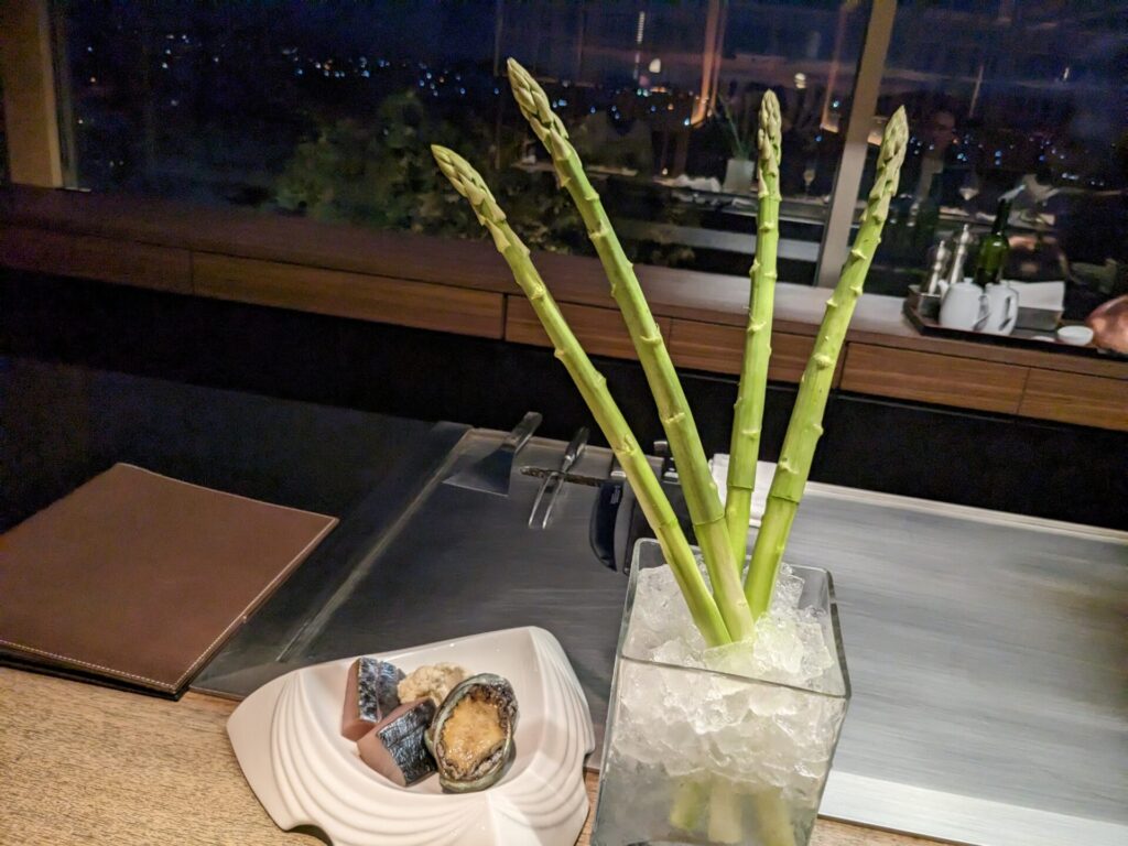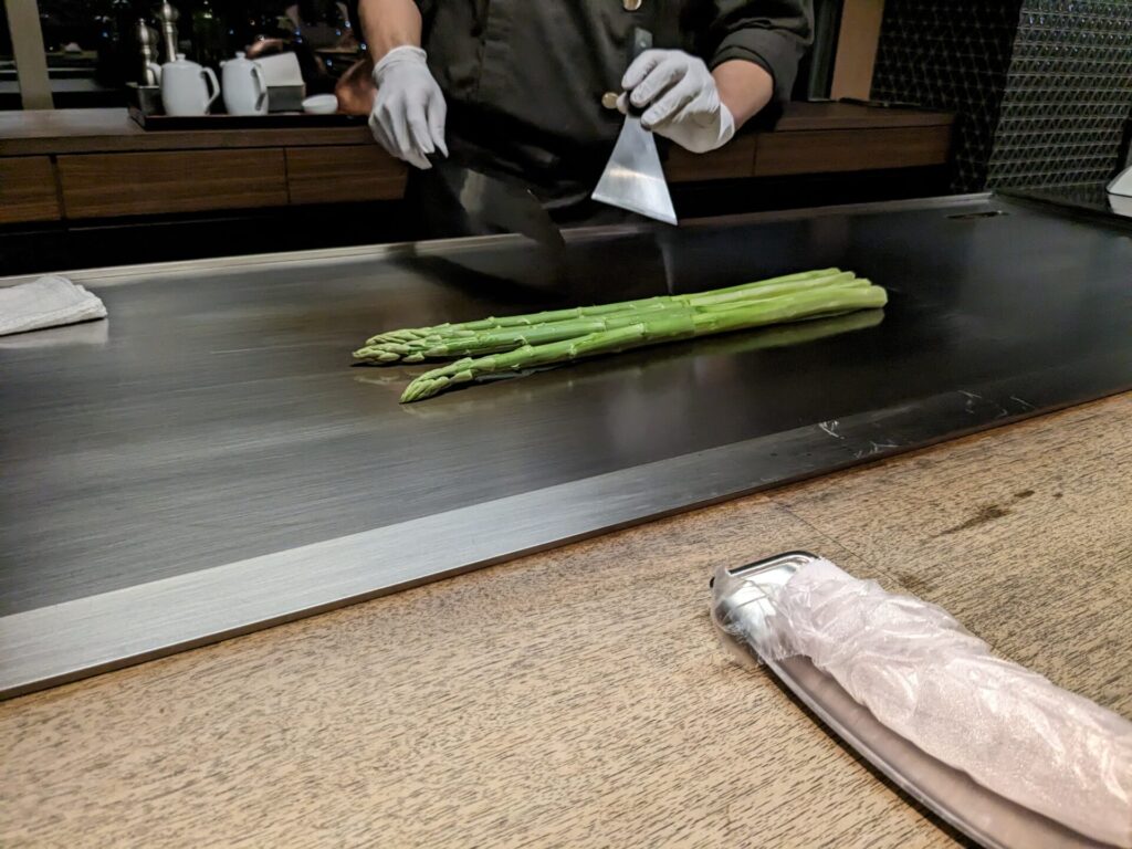 今日の夕食は、鉄板焼きのコースです。鉄板焼きは2回目です。鉄板焼きの醍醐味は「素材の味をシンプルに楽しむ」だそうです。