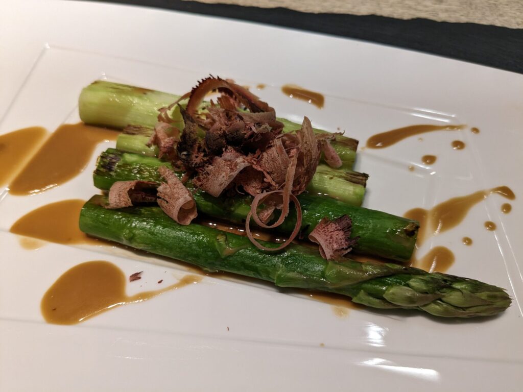 アスパラガスは、根元のほうが甘いらしく、穂先から食べて、最後根元を食べるのがおすすめだそうです。削りたての鰹節と、ゴマだれでいただきます。