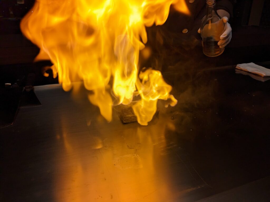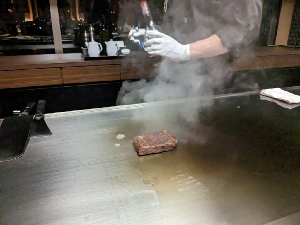 焼きはじめると、香ばしい香りが広がります。この香り楽しむのも、鉄板焼きコースの醍醐味ですね。