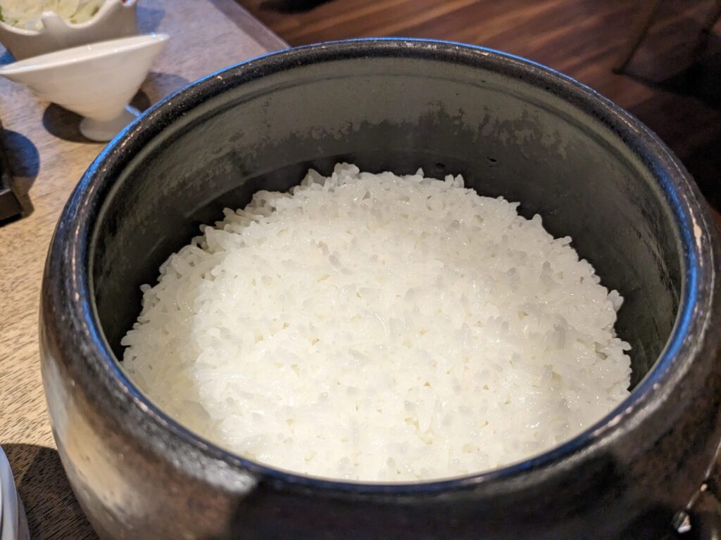 岩手県産のお米だそうです。土鍋で炊いて、つやつやです。