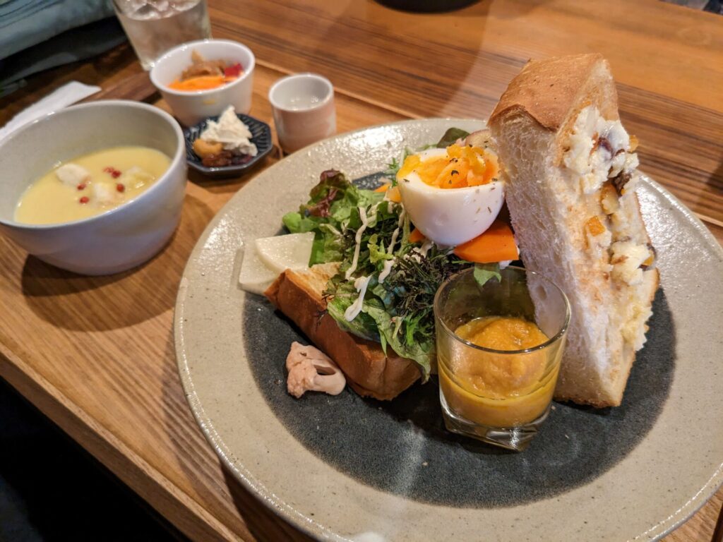 野菜たっぷりのトーストのセットと、