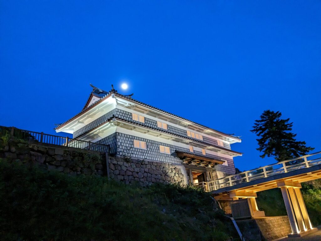 月とライトアップされた門。威風堂々とした門ですね。金沢城には天守はありませんが、すごく敷地が広くて、お金持ちの藩だったんだろうな、と想像できます。