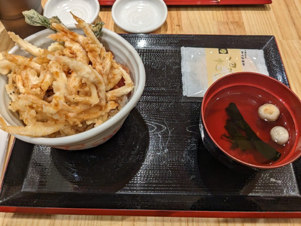 少し並びましたが、無事に食べることができました。白えびの刺し身丼と、白えびのかき揚げ丼を注文してシェアすることにしました。