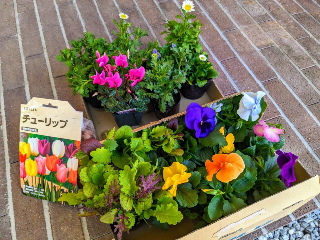 まず、花壇の植え替えですが、チューリップやパンジー、ノースポール、ガーデンシクラメンなどを買ってきました!