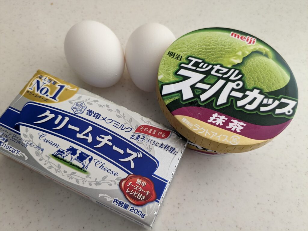 たまたま、youtubeで「スーパーカップ(抹茶味)」を使ったチーズケーキの作り方を紹介していて、簡単そうなのでやってみました。