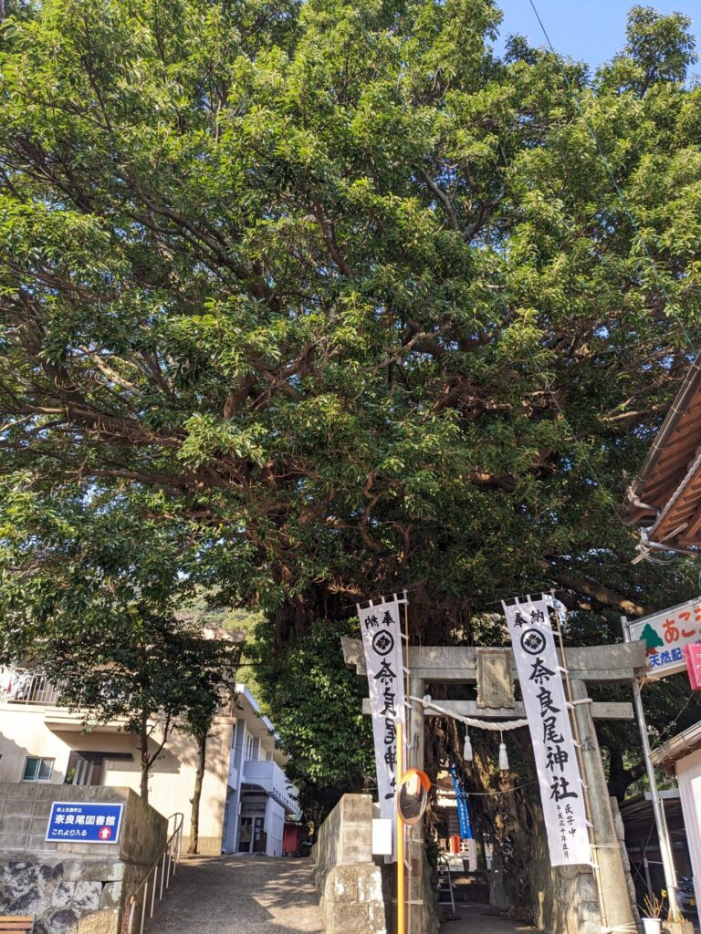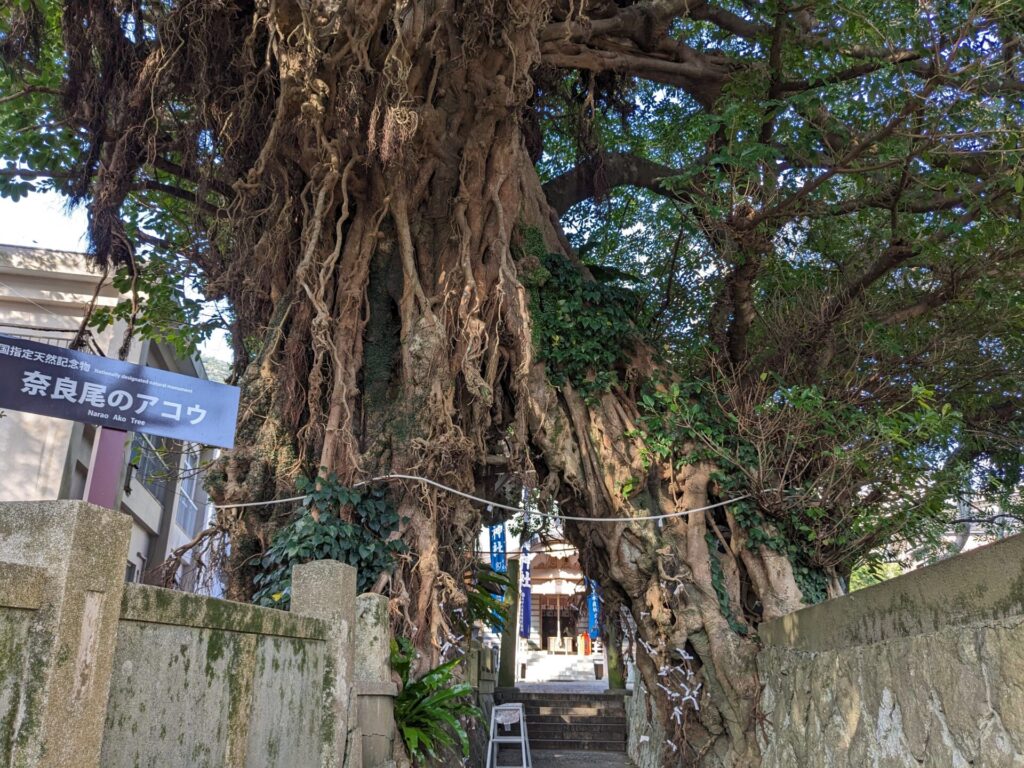 船は、ジェットフォイルという高速船で、福江から奈良尾まで、30分で運行します。奈良尾港について、レンタカーの手続きをしてから、まず向かったのが、奈良尾神社のアコウ樹。樹齢650年のアコウの木で、かなりのパワースポットとのこと。