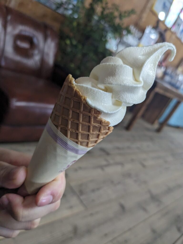 矢堅目の駅で、塩ソフトクリームを食べて、