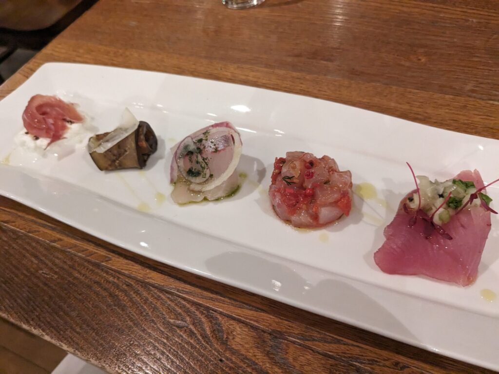 左から、ブラッターチーズと生ハム、ナスのボロネーゼソース、ヒラマサのカルパッチョ、メバルのタルタル、ヨコワのカルパッチョ。