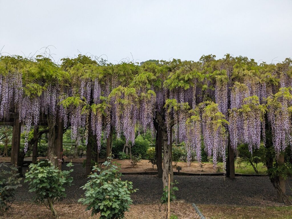 到着してすぐ、駐車場横の広場の藤棚が目に着きました。なんと藤の花が満開♪ 今まで何度も来ていますが、藤棚があることに気づいていませんでした。