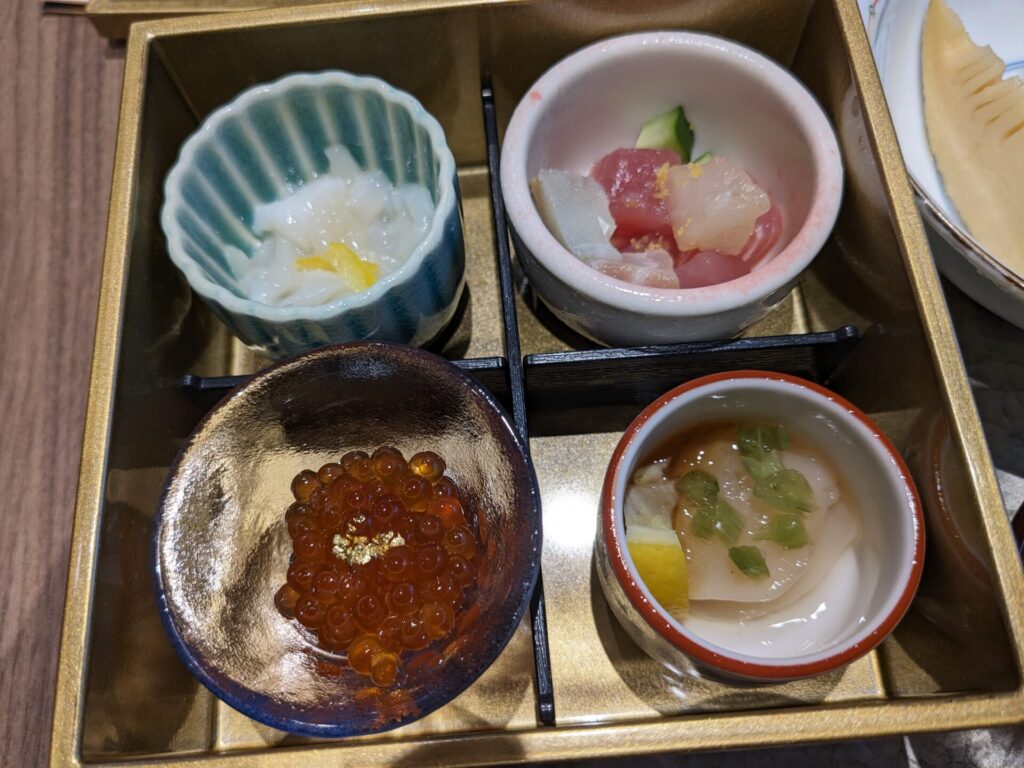 お重に入った4種類の海鮮、見た目の美しさはもちろんですが、どれもとてもおいしい!! 味がしっかりとついていて、それでいて濃すぎない、いい具合です。