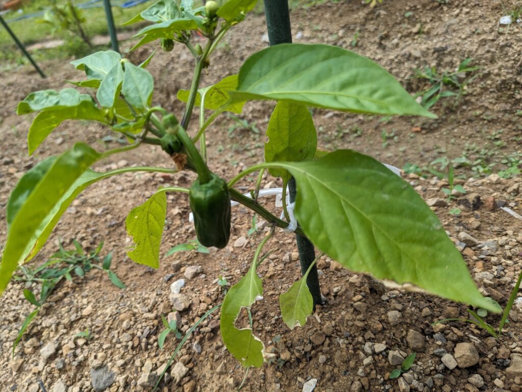 それでは、現在の作物の様子を少し・・・。まずピーマン。かわいい実をつけています♪