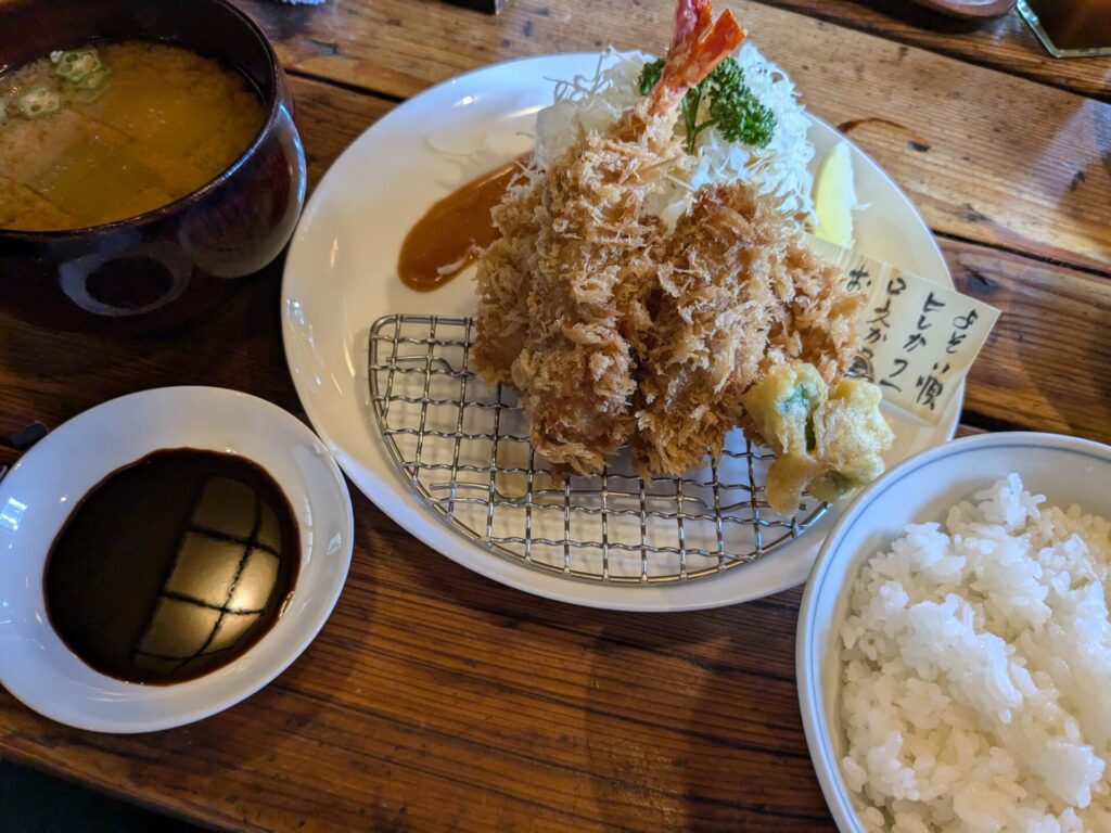 ここでは、看板メニューの「とんかつ三味定食」を注文。日村さんも食べていたものです。