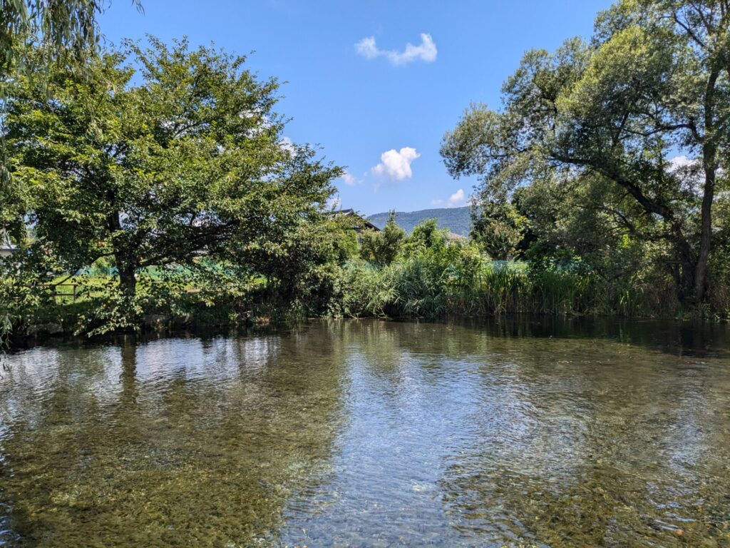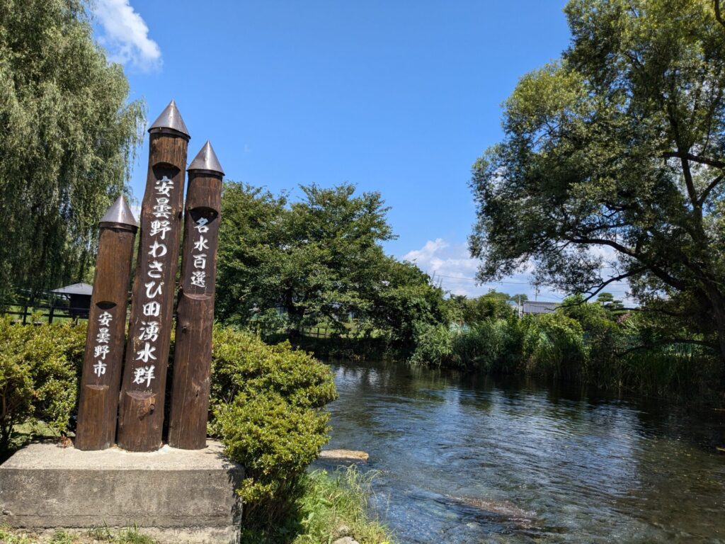 伏流水となった北アルプスからの雪解け水が湧き出している場所で、1日70万トンもの水が湧き出ているとのこと。真夏でも水温が15度以下で、わさび栽培や、ニジマスの養殖に使われているそうです。