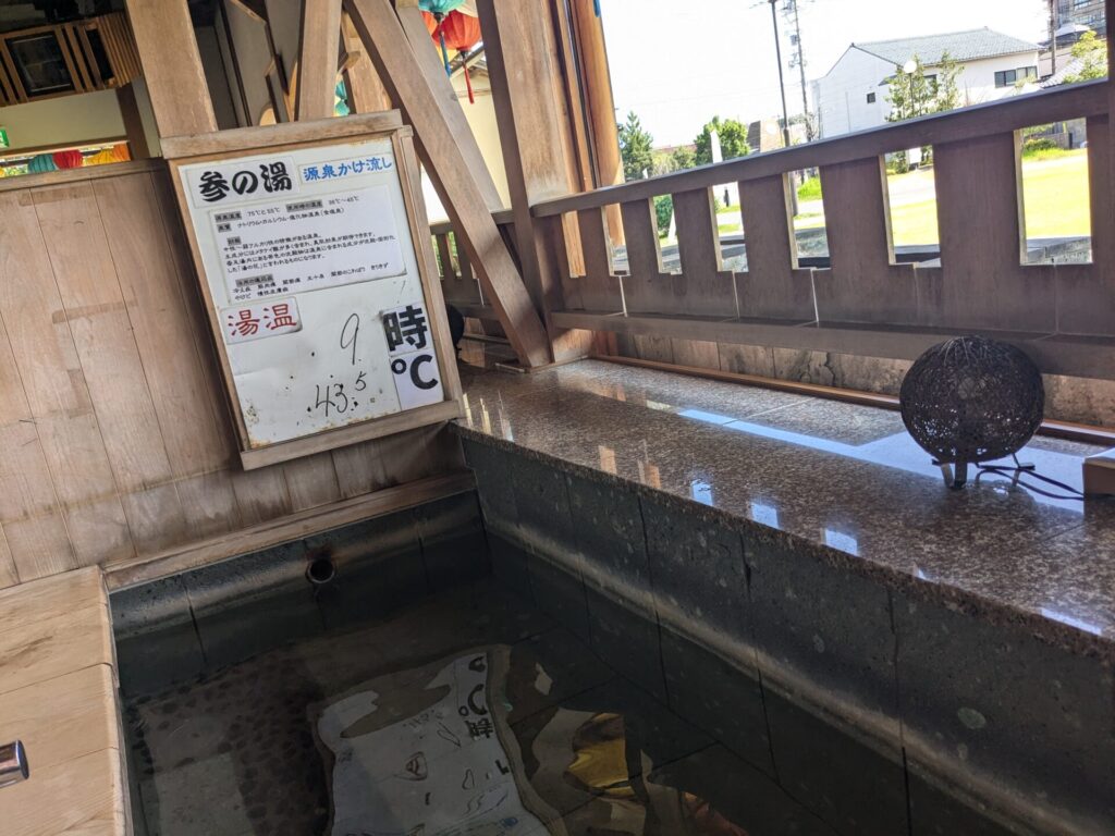中に、いくつものお湯(効能の違う温泉)があって、好きな足湯を楽しめます。少々暑かったですが、足湯を楽しむことができました。
