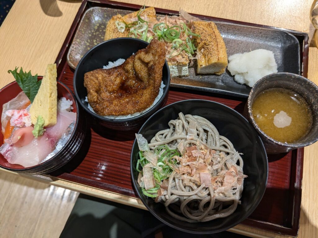 海鮮丼に、油揚げ、ソースカツ丼にお蕎麦。これでもか、というくらいの量でした。おなかいっぱいになりました。
