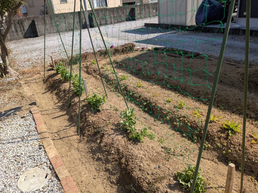 したことといえば、スナップえんどうのつるがずいぶん伸びてきたので、支柱を建てたくらいかな。