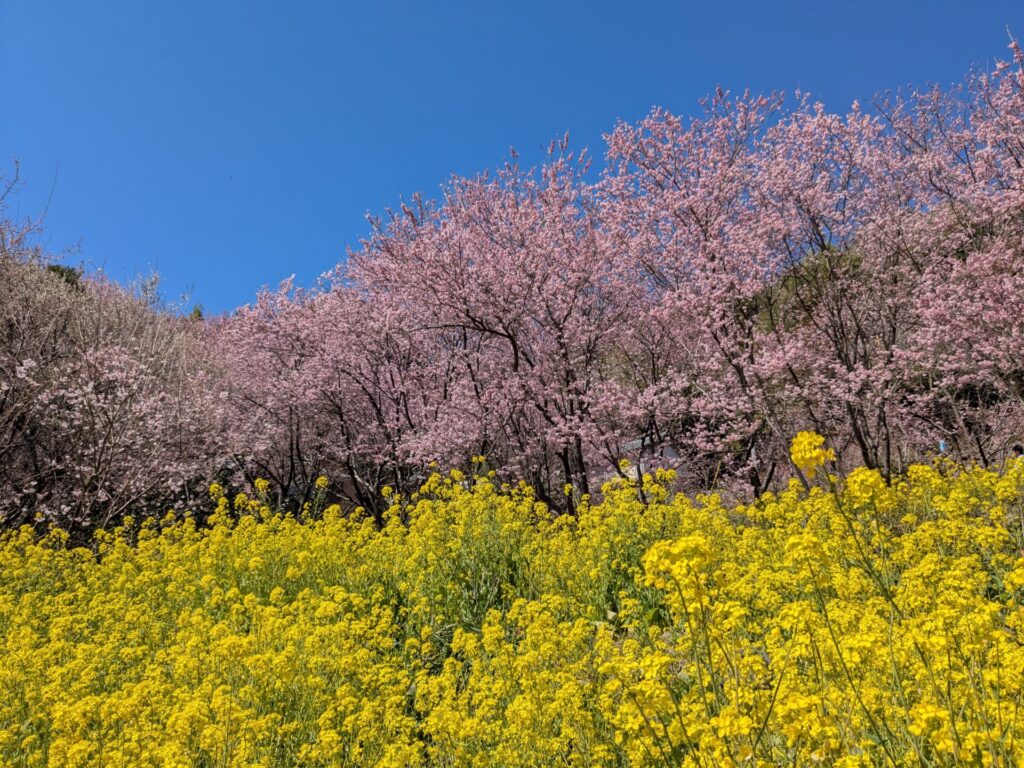 そして、山の斜面にいっぱいに、雪割桜と、菜の花が同時に満開を迎え、絶景を楽しむことができます。