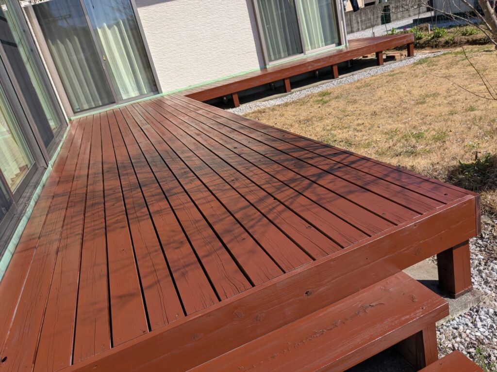 ウッドデッキ綺麗ですね。10年経つといろいろと劣化が目立つものですが、さすがメンテをしていると長く持つものですね。自分も見習わらないと。