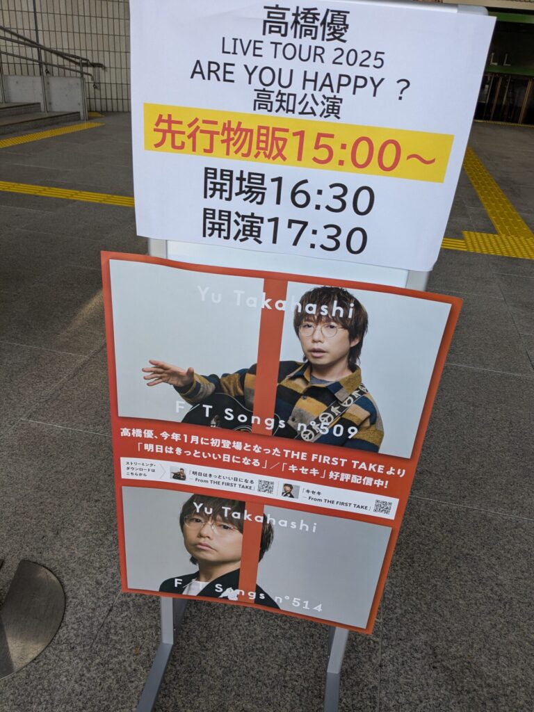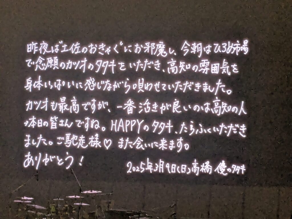 5時半から始まって、終わったのが8時20分ごろ。たくさん曲を歌ってくれて、MCでは高知ネタもたくさんしてくれて、楽しかったです。