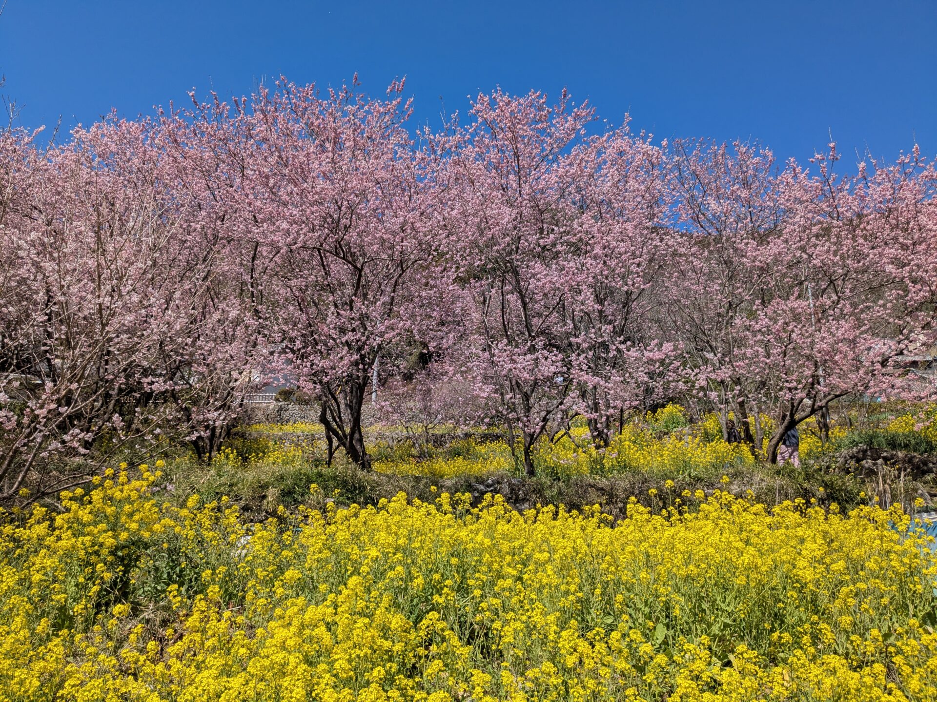 そして、山の斜面にいっぱいに、雪割桜と、菜の花が同時に満開を迎え、絶景を楽しむことができます。