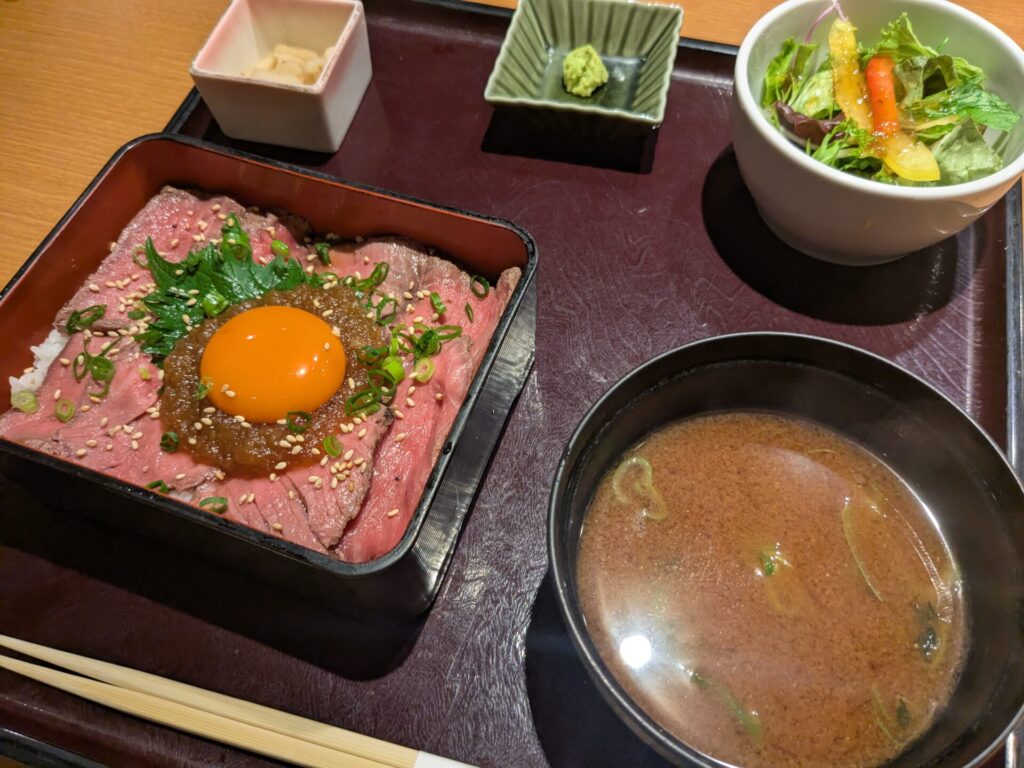 どこも結構な人出でしたが、宮崎料理のお店がちょうど席が空いていて、入ることにしました。ローストビーフ丼と、チキン南蛮です。