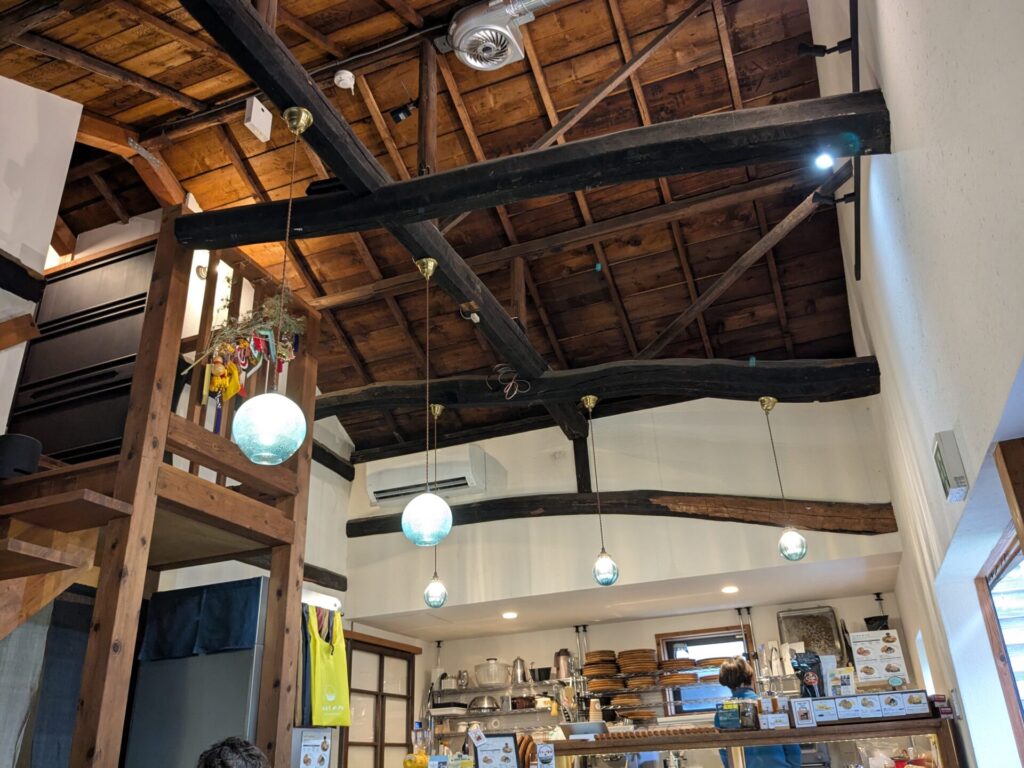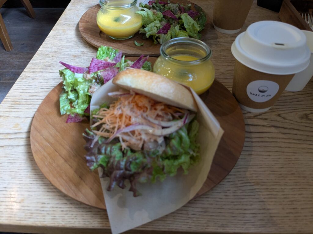 ここあたりでちょうどお昼くらいになったので、「なみまちベーグル」という古民家を改装したベーグルのお店で、ランチを食べました。