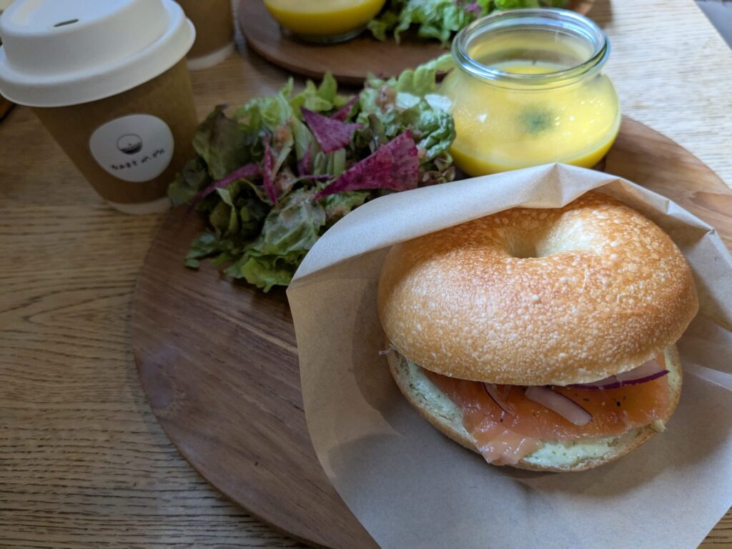 まあ、オシャレというか、センスがよいというか・・・とってもいい雰囲気で、女子旅で人気がありそうなお店です。ベーグルのセットはこんな感じ。