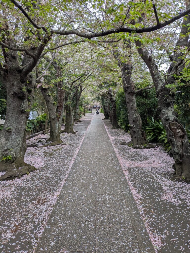 極楽寺の参道の桜の花びらの絨毯いい感じです。ナイスショットです。