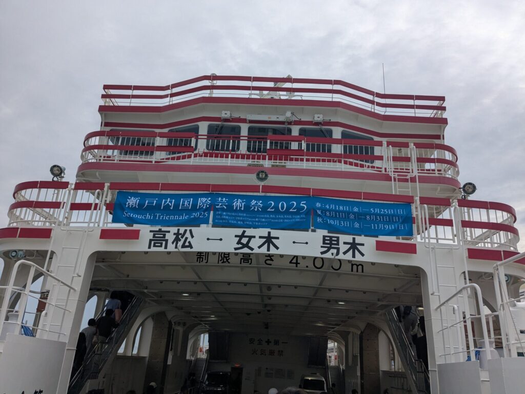 まず初めに行ったのは、女木島、男木島のエリア。高松港朝8:00発のフェリーで、女木島に向かいます。