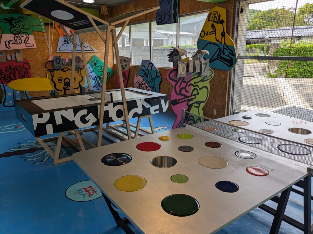 「ピンポン・シー」様々な卓球台があって、実際に卓球を楽しめます。僕たちは、一番奥に見える台で1ゲームプレイしました。台が左右に動き、思いがけずに傾くので、球の動きが読みづらく、それが面白かったです。