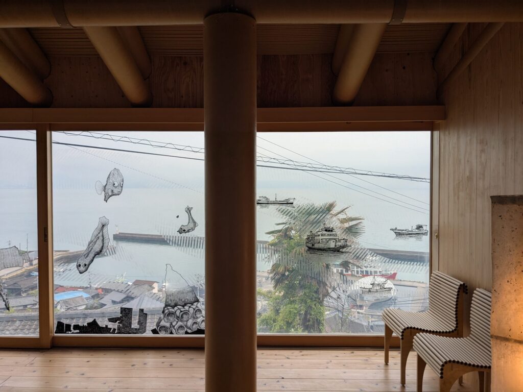 「男木島パビリオン」写真では少しわかりにくいですが、紙管を使用した建物で、窓からは島の風景が見渡せます。大きな窓をキャンパスに、描いている絵も素敵です。