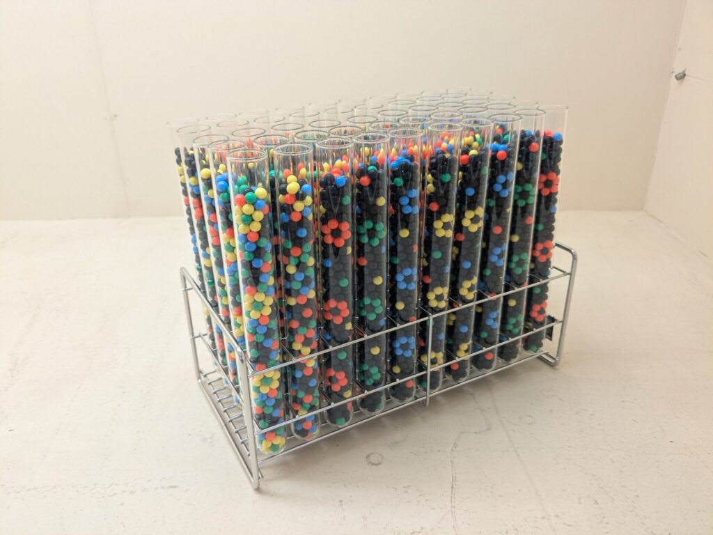 試験管のなかのビーズ、どうやったら花型にできるのか、不思議です。