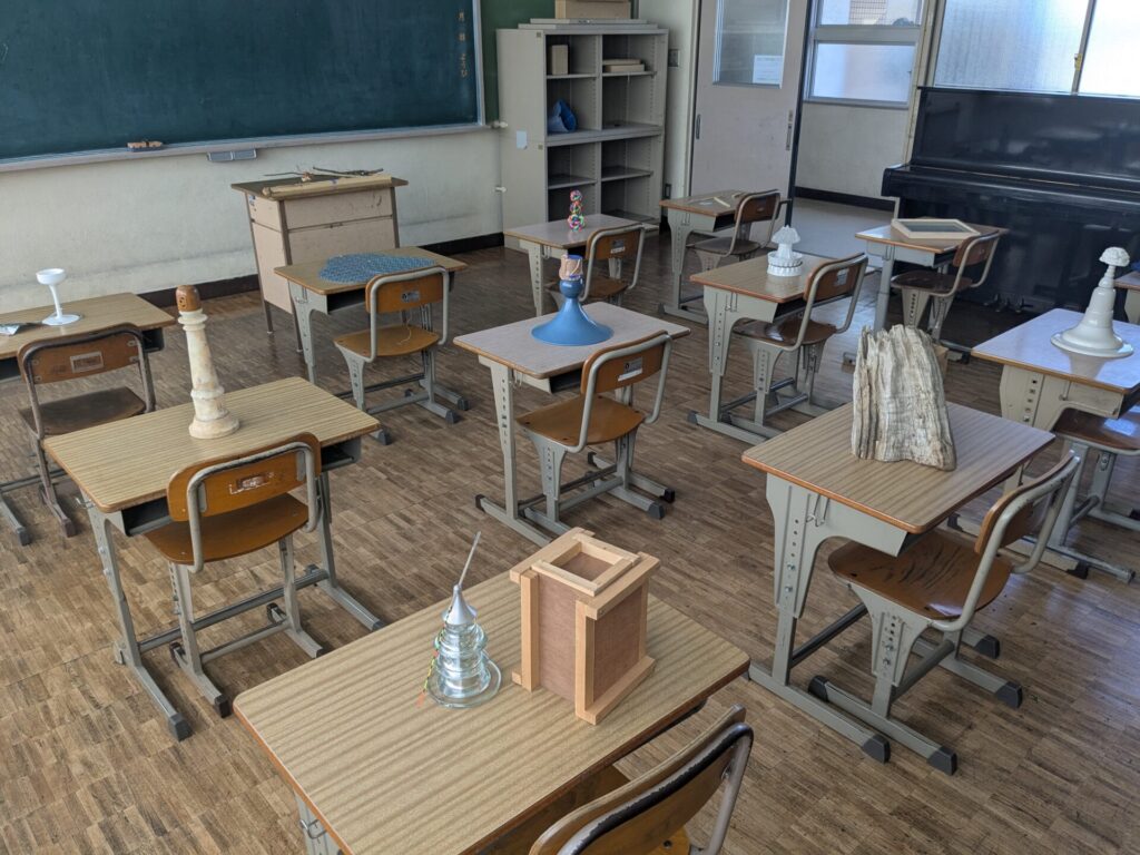 「瀬居島プロジェクト「SAY YES」」瀬居中学校、小学校、保育園に、それぞれの学校の備品を使った展示がたくさんありました。身近なものでも、アートになるんだなあ、と感じたことでした。