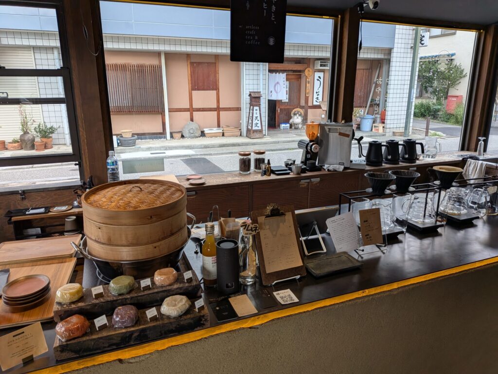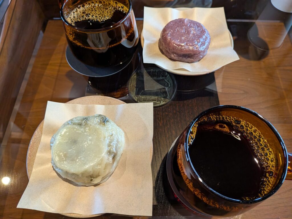 1杯ずつドリップした美味しいコーヒーと、あんこと高菜のおやきが出てきました。とってもスローな雰囲気と、非日常感が旅行に来たな、という感じがします。