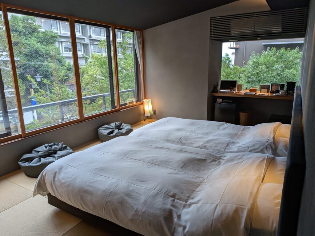 とても窓が大きく広々としたお部屋で、いい感じです。それに加えて、なんと半露天風呂付きなんです!