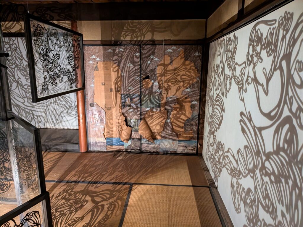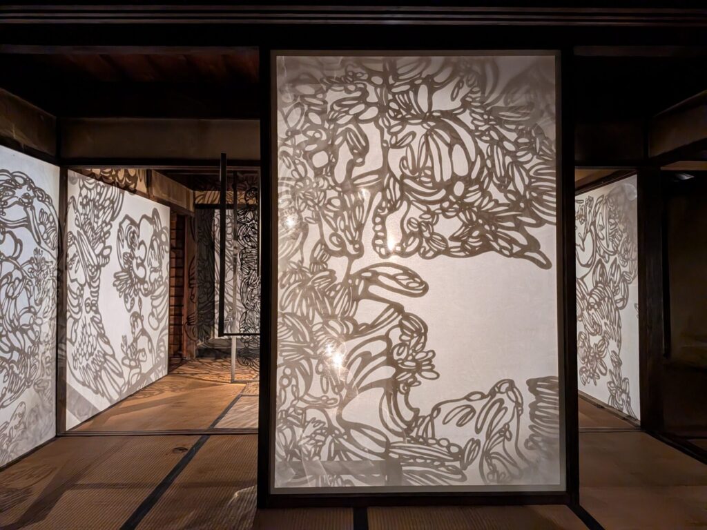 部屋全体に、大きな影絵が置かれていて、白い幕だけではなく、畳や壁、建物全体に影が映っている様子がおもしろかったです。