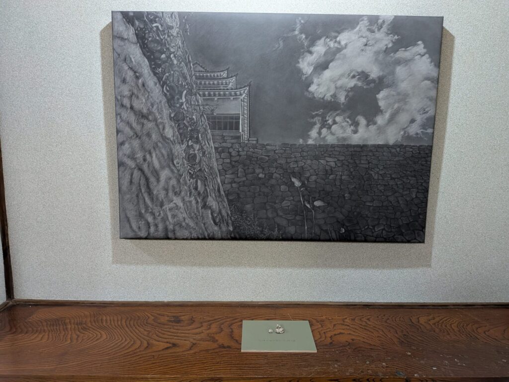 丸亀城の石垣の麓に転がっていた石を使って、丸亀城を描いています。
