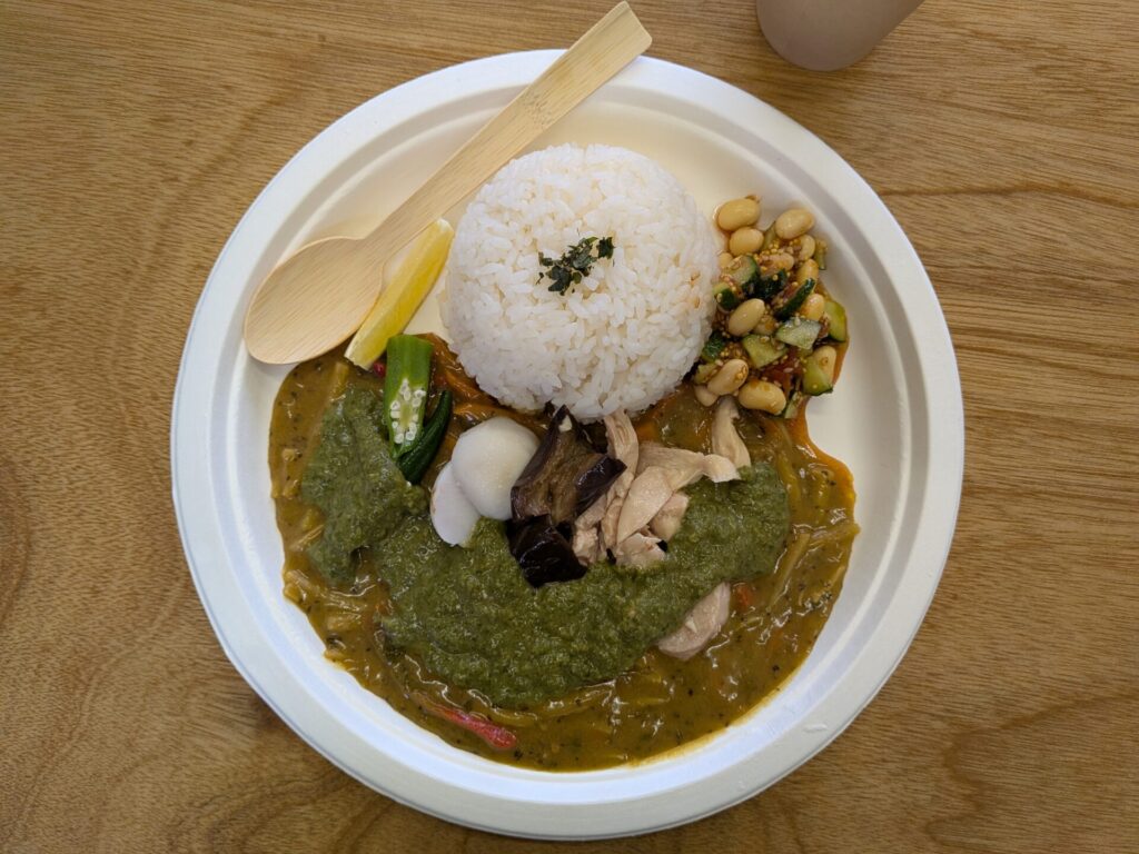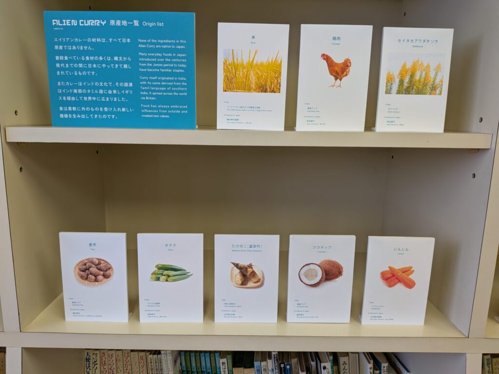カレーにかかってる緑のソースは「セイタカアワダチソウ」という外来植物のソースで、他の材料もすべて、日本原産ではないようです。