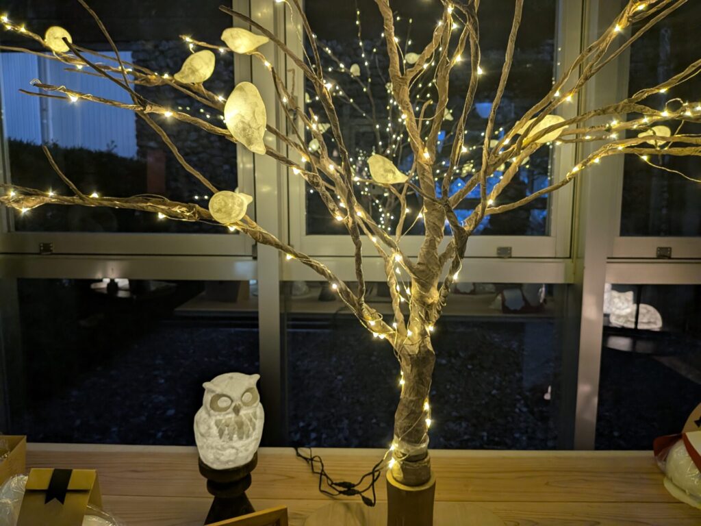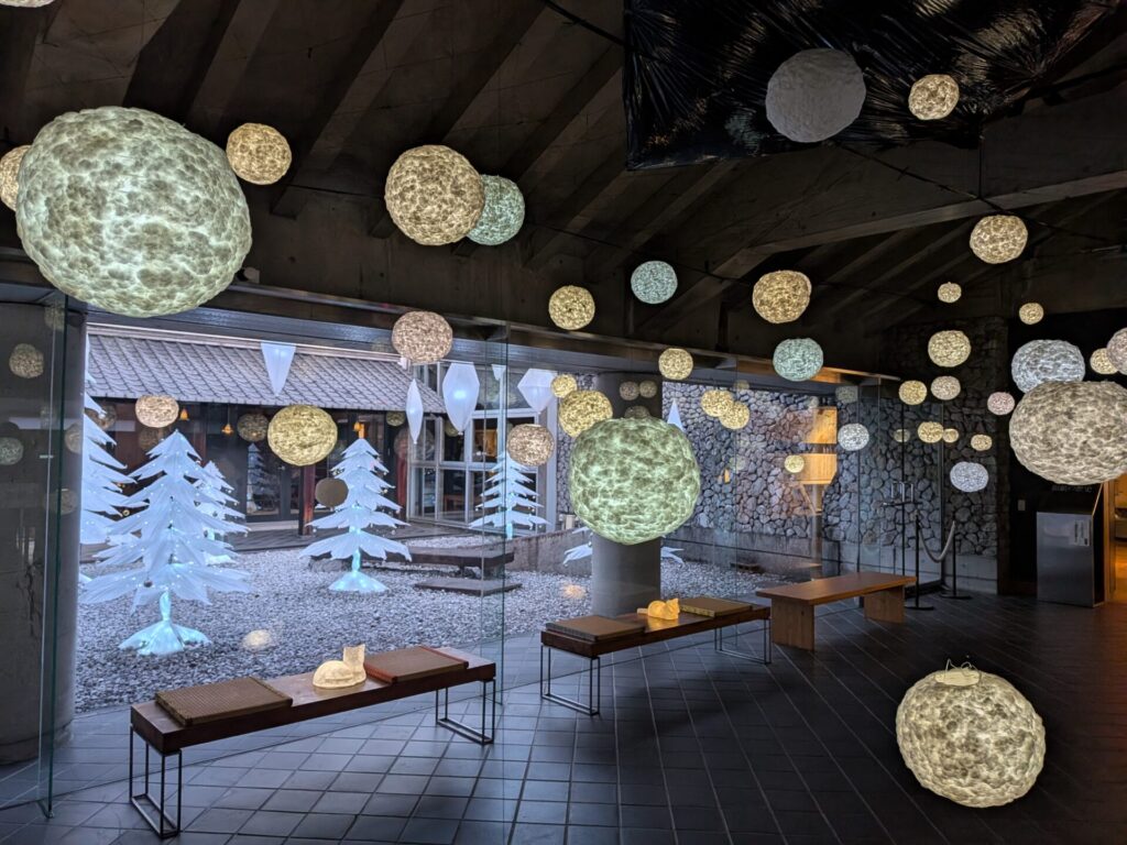 和紙で作った大小様々な球体が、優しい色の明かりで吊り下げられていて、とても素敵な空間になっています。