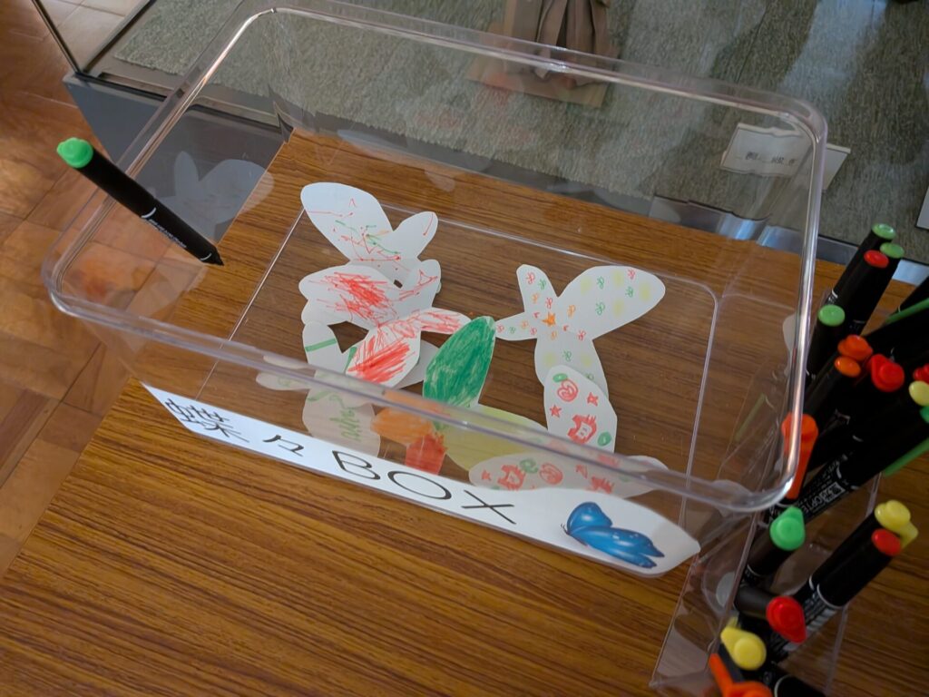 蛍光色に光ったちょうちょがとても際立つ作品だな、と思いました。実は、このちょうちょは、参加者が蛍光ペンで塗ったものを貼り付けているようです。