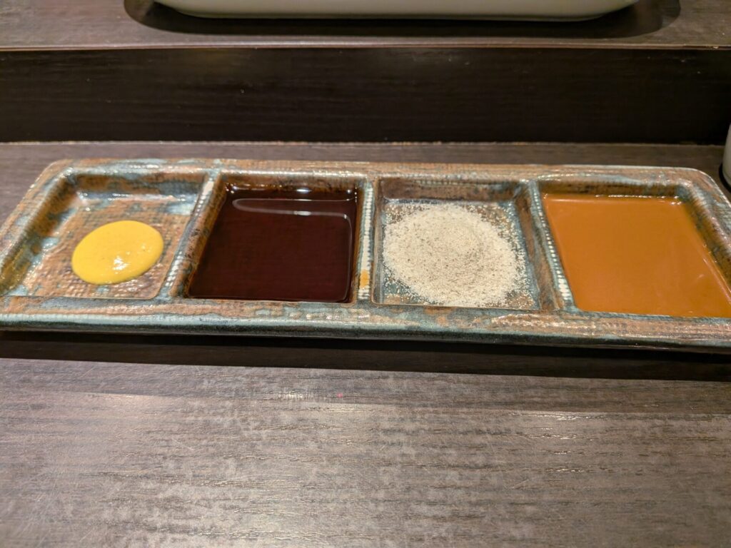 注文したのは、おまかせコース。創意工夫された串カツが次々に出てきて、4種類のタレで楽しむことができます。