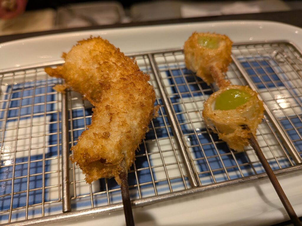 えっ?!シャインマスカットの串揚げですか?すごいですね。創作すぎます。