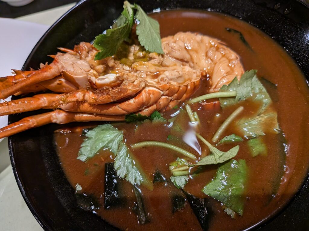 伊勢海老の赤だし。伊勢海老は半身入っていて、とくにみその部分が、めちゃおいしかったです☆