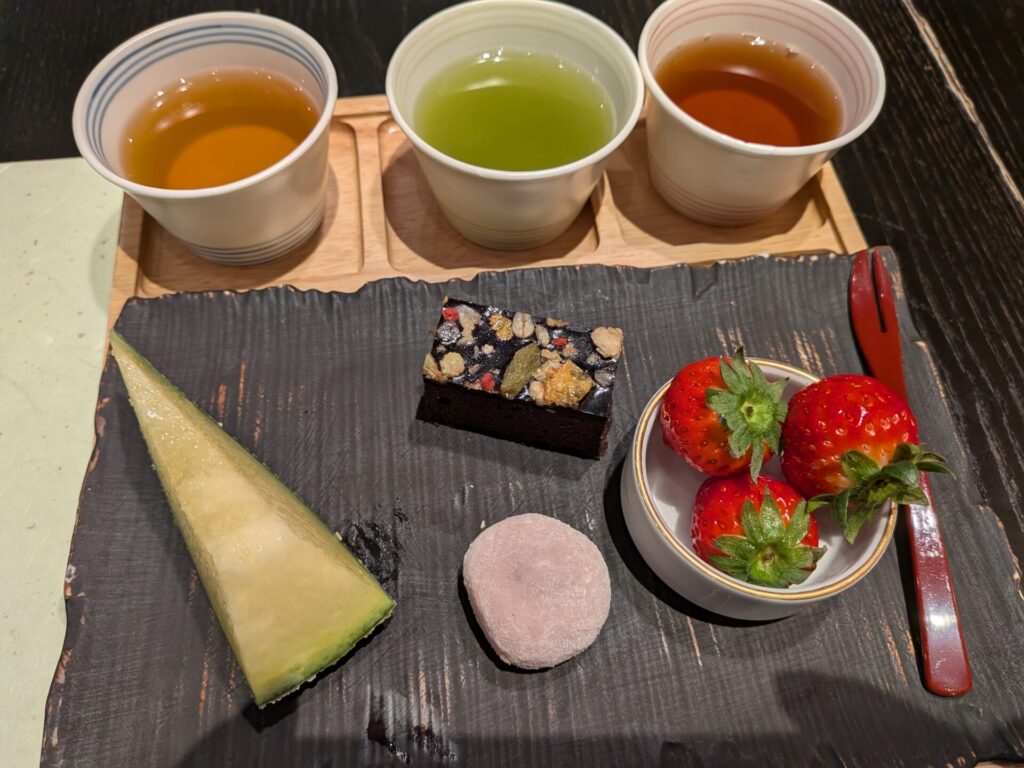 三種はお茶のことだったんですね。左からほうじ茶、抹茶、和紅茶です。お腹いっぱいになりました。