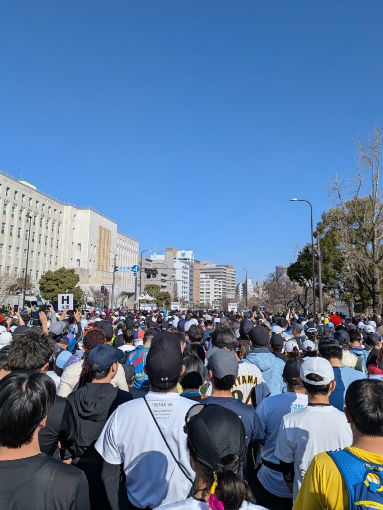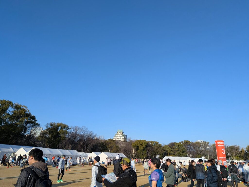 前置きが長くなりましたが、いよいよマラソン当日の日曜日。朝7時に家を出発し、大阪城公園駅は、すごい人で、ごった返していました。