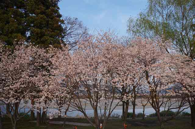 帰りに、すぐ近くの河原の桜を見に行きました。時間が遅かったのと、天気がいまいちだったのが残念でしたが、桜満開で、とってもきれいでした。