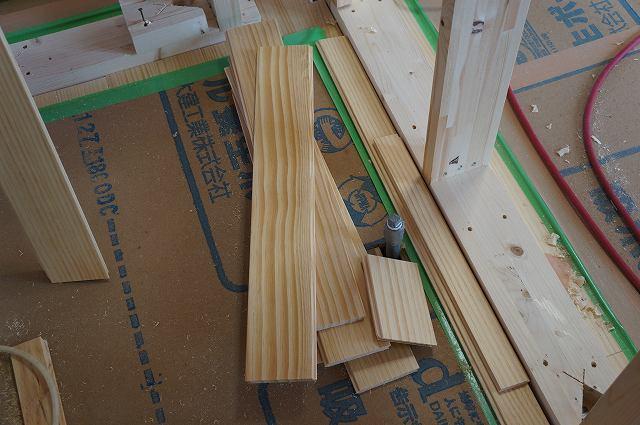 今日も、前回と同じ大工さん2人で作業をしていました。今日は、床のフローリングの貼り付けをしていました。無垢のフローリング材を1本1本、丁寧に張り付けていました。