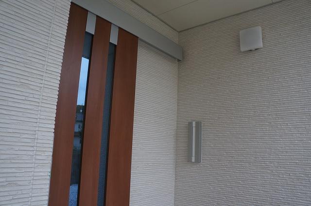 玄関のドアの養生シートが外され、ミディアムチェリー色の扉が、見えるようになりました。照明やポスト、インターホンなどの配置もいい感じで、とってもおしゃれな玄関になりました