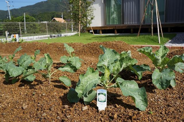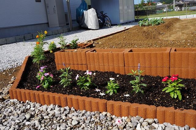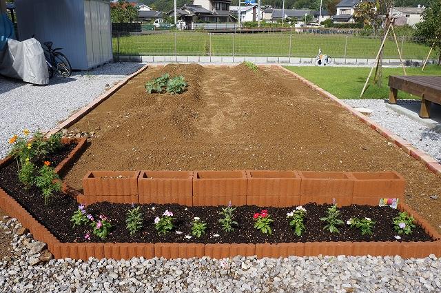 花壇はL字型にして、車で入ってきた時によく見える位置に作ってみました。また、畑の周囲にはレンガを並べて、畑の土が流れないようにしてみました。